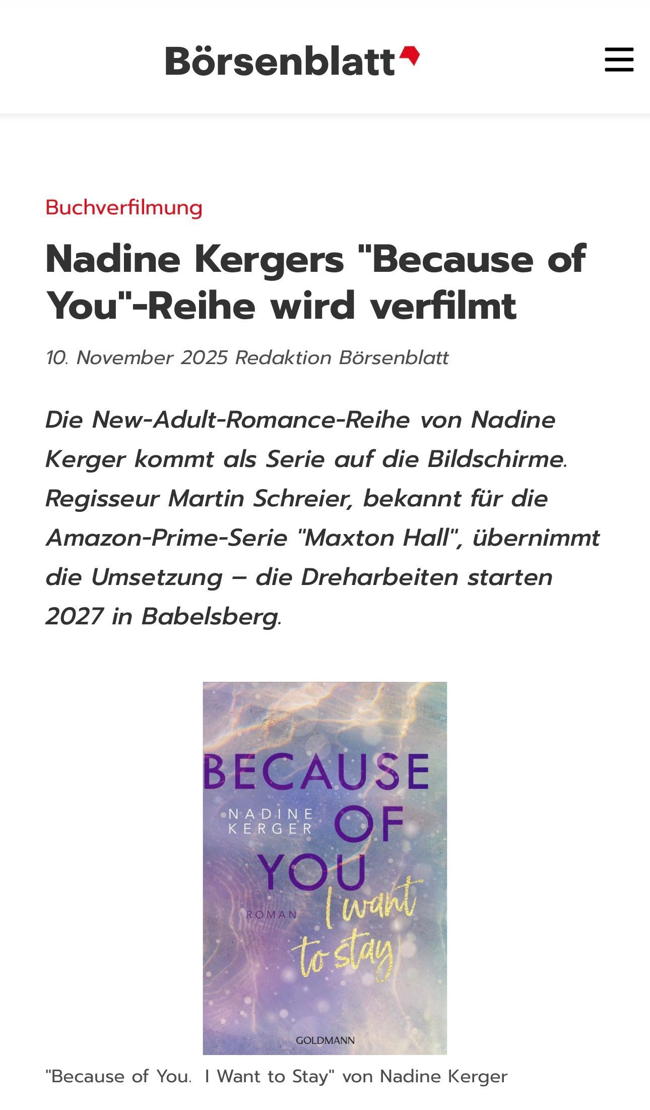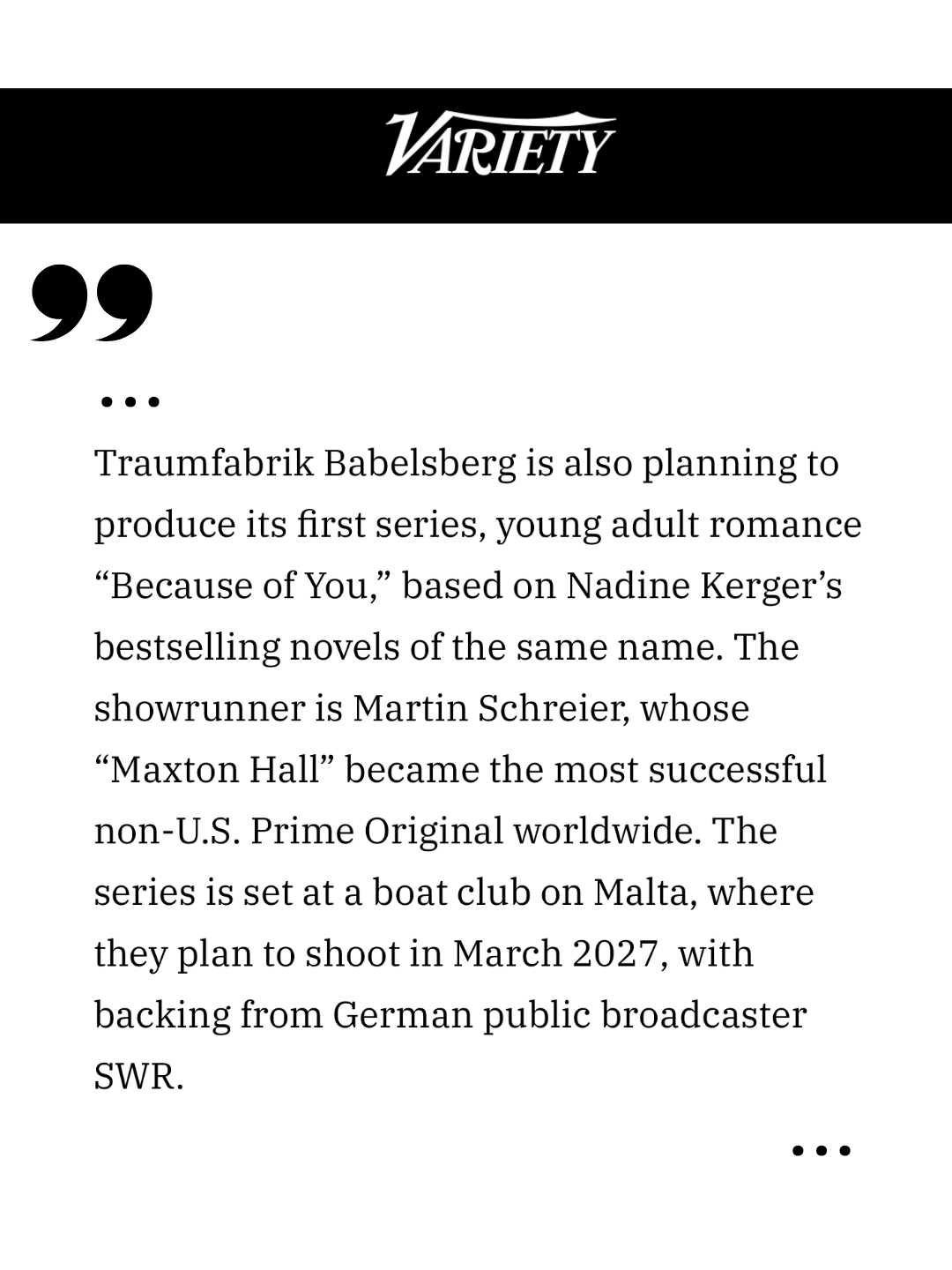 Ein Traum wird wahr ... Traumfabrik Babelsberg hat sich die Rechte an der "Because of you"-Reihe gesichert und wird die Romane für den SWR verfilmen.